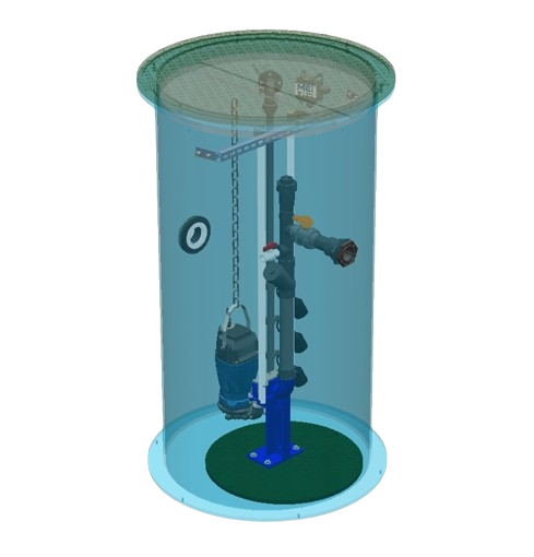 Chaque résidence ou bâtiment possède sa propre station de pompage. Celle-ci consiste en un réservoir étanche équipé d’une pompe d’égout brute spécifiquement choisie pour le projet, d’un clapet antiretour, d’une vanne d’arrêt, d’un dispositif antisiphon, d’un régulateur de niveau, d’une ouverture pour échange d’air et d’un panneau de contrôle.